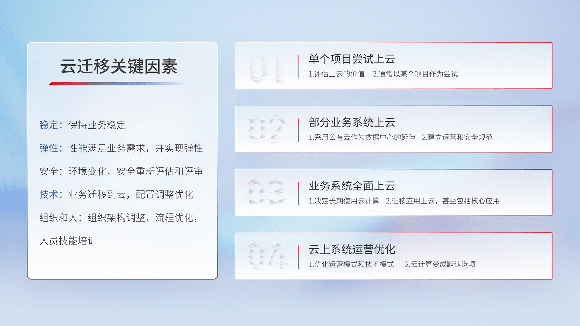 结合实际业务,,从规划设计、、云平台选型、、云原生改造、、、、数据迁移、、、、集成交付,,,,迁移全过程为客户识别最佳上云路径,,做好风险识别管理,,,设计网络架构、、身份权限、、安全审计合规、、操作审计、、、、日志审计、、、监控告警策略、、、、多站点容灾设计等,,,对云上基础设施进行整体规划,,,提升IT治理水平,,,,以满足弹性、、高可用、、高性能的需求。。。。
