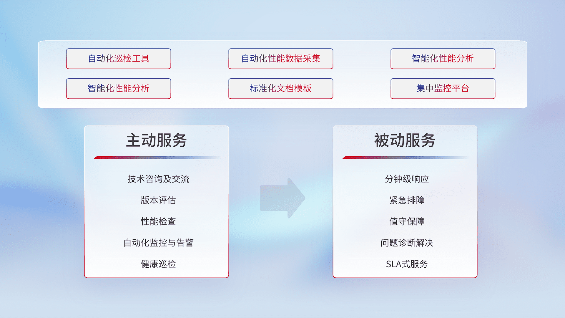 智能化工具和标准化文档,,保障服务质量,,,提供主动服务(包含技术咨询、、版本评估、、性能检查、、、、自动化监控与告警、、、健康巡检)和被动服务包含(分钟级响应、、、紧急排障、、值守保障、、、、问题诊断解决、、、、SLA服务)。。